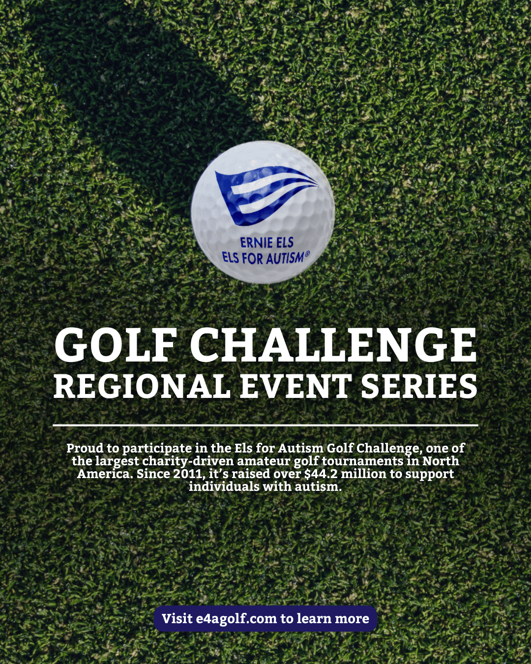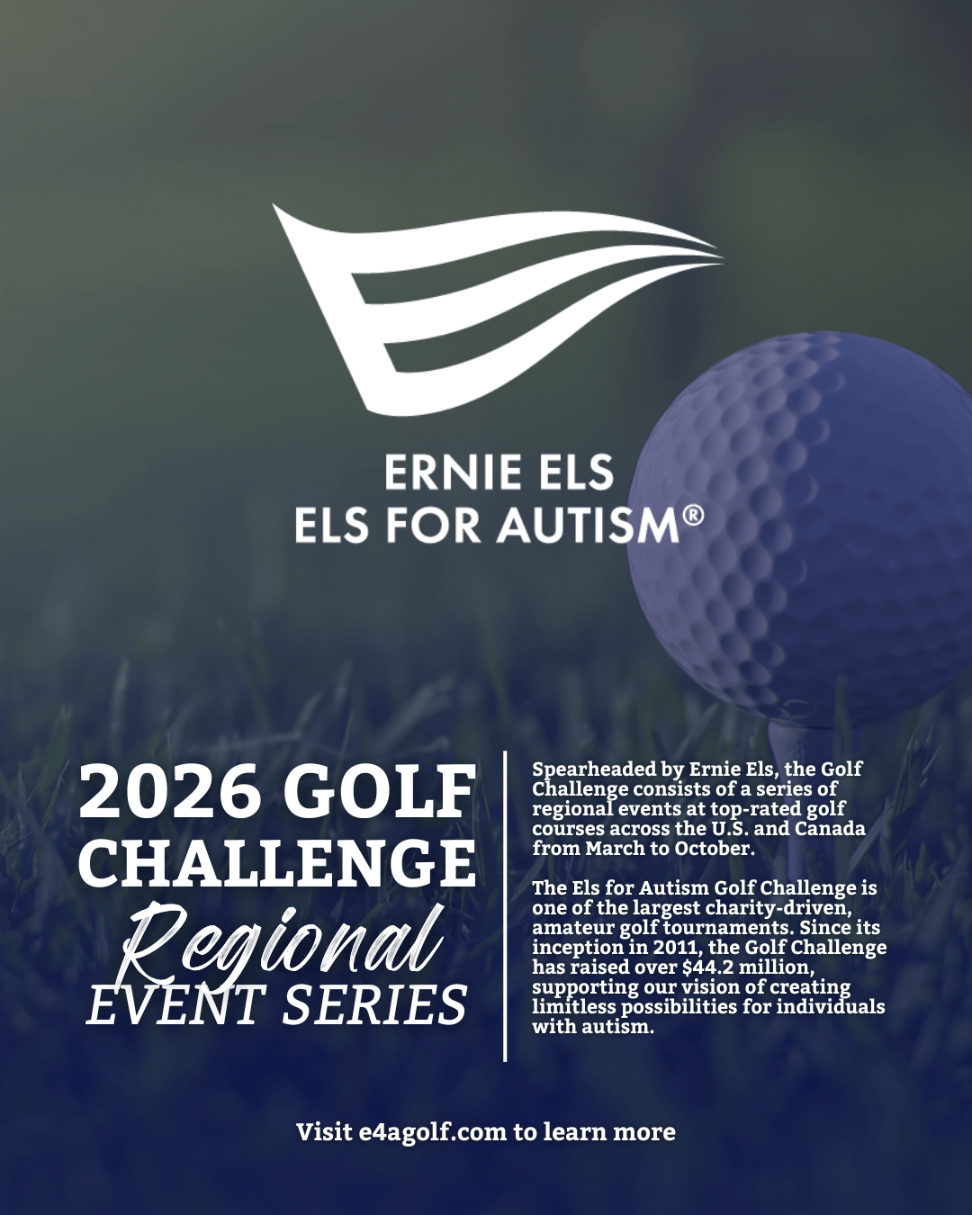 2.) I’ll be playing in [your regional event] on behalf of [company]this year as part of the 2026 Els for Autism Golf Challenge! Honored to be part of this impactful event helping fund programs that change lives. Want to be part of it? Sign up or donate at e4agolf.com, let’s drive change, one swing at a time.